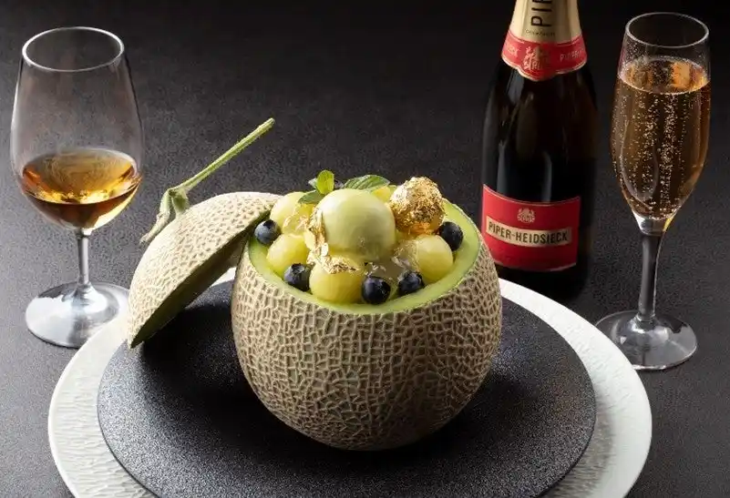 | シャンパンのハーフボトルをメロンの器に注いでお召しあがりいただくほか、添えたデザートワインはシロップ代わりに味変としてお楽しみいただけます。マスクメロンの濃厚な甘みと、デザートワインの風味のマリアージュも、あわせてご堪能ください。 | ||||||||||||||||||||||