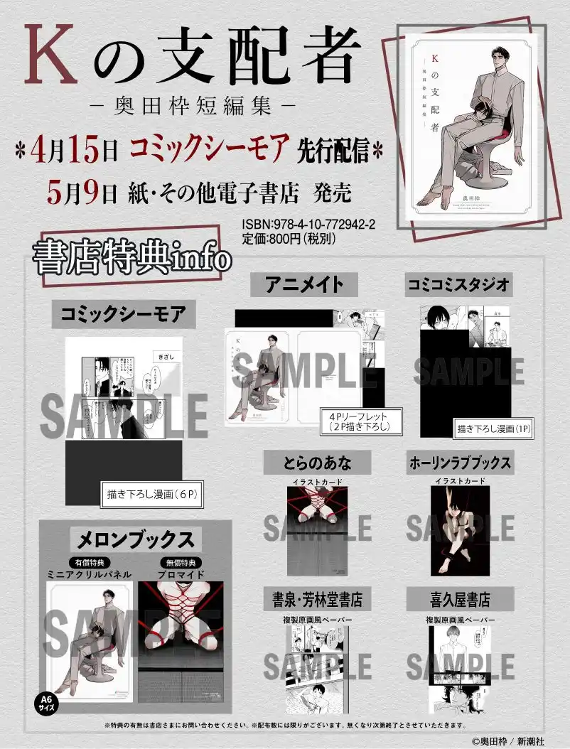 株式会社新潮社が刊行する『Kの支配者 ―奥田枠短編集―』が、2026年4月15日(水)より、コミックシーモアにて先行配信を開始いたしました(https://www.cmoa.jp/title/355304/)。
