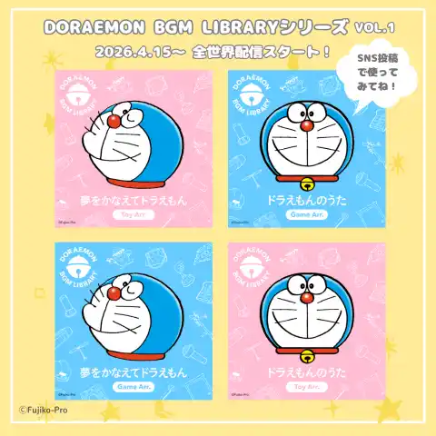 「ドラえもん」のBGMシリーズ「DORAEMON BGM LIBRARY」が本日より全世界配信スタート!第一弾として「ドラえもんのうた」「夢をかなえてドラえもん」の2曲を、ピアノ・木琴・トイ楽器等の柔らかな音色で可愛らしくアレンジした〈TOY Arr.〉、ポップで遊び心のある電子音でゲーム風にアレンジした〈GAME. Arr.〉の各2タイプを4/15(水)より配信開始する。「ドラえもん」の公式イベント等でも使用される他、公式音源としてSNSユーザーが楽しめるよう、映像に合わせやすいアレンジとなっている。「DORAEMON BGM LIBRARY」は各SNSにも公式音源として追加されるので、投稿の際に是非この公式音源を使ってみよう! |