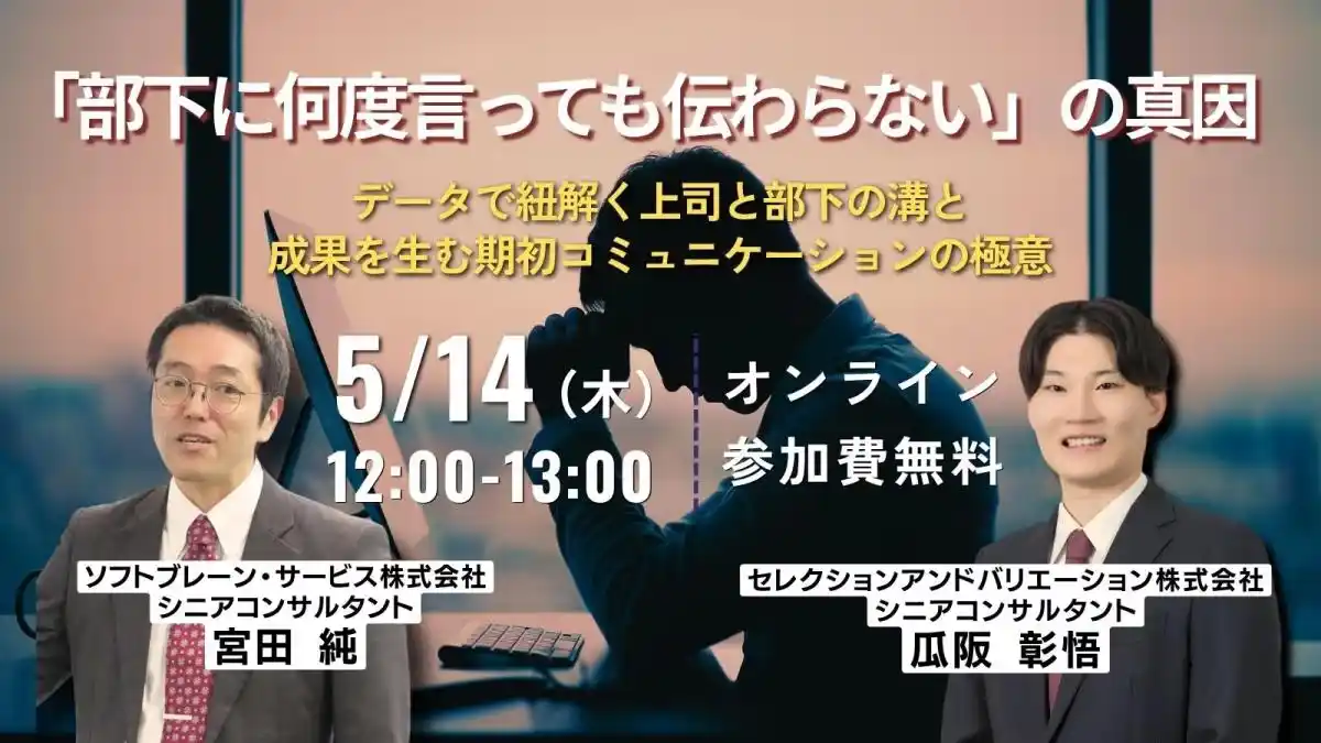 | 組織・人事コンサルティングファームであるセレクションアンドバリエーション株式会社(以下、当社、東京都千代田区丸の内、大阪市西区、名古屋市西区 / 代表取締役社長:平康慶浩/ URL:https://sele-vari.co.jp/ )は「「部下に何度言っても伝わらない」の真因ーデータで紐解く上司と部下の溝と、成果を生む期初コミュニケーションの極意(ソフトブレーン・サービス株式会社様との共催セミナー)」を2026年5月14日(木)12:00~13:00に開催することをお知らせいたします。 | |||||||||