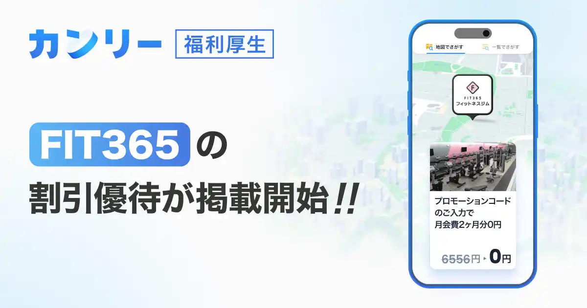 株式会社カンリー(本社:東京都品川区、代表取締役:辰巳 衛 / 秋山 祐太朗)は、提供する福利厚生サービス「カンリー福利厚生」において、株式会社ヤマウチ(本社:香川県高松市、代表取締役:岡本 将)が運営するフィットネスジム「FIT365」の優待がリニューアルされたことをお知らせいたします。 |