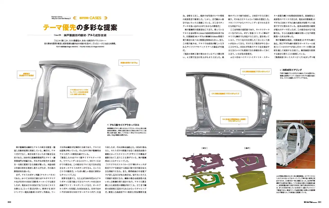 「テクノロジーがわかると、クルマはもっと面白い」をコンセプトに、技術的な視点で自動車業界を分析する月刊誌モーターファン・イラストレーテッド。最新号となるvol.235は、巻頭特集として「クルマはどうして重くなるのか?」を掲載しました。モデルチェンジの度に重くなっている現代の乗用車ですが、その理由は何なのかを、改めて検証しました。一般的には衝突安全基準の厳格化に伴うボディ強化のため、と言われてきましたが、それだけではない事実を解説しています。 さらにスチール、アルミの有力サプライヤーなどに最新の事例を取材し、重量増加を抑える技術の数々をご説明いただきました。またスーパー耐久ST-Qクラスに挑むマツダの独自テクノロジーを紹介する短期連載や、水素を利用する燃料電池、バッテリーのサプライヤーが数多く出展したスマートエネルギーweek【春】のレポートも掲載。その他の人気レギュラー企画にもご注目下さい。