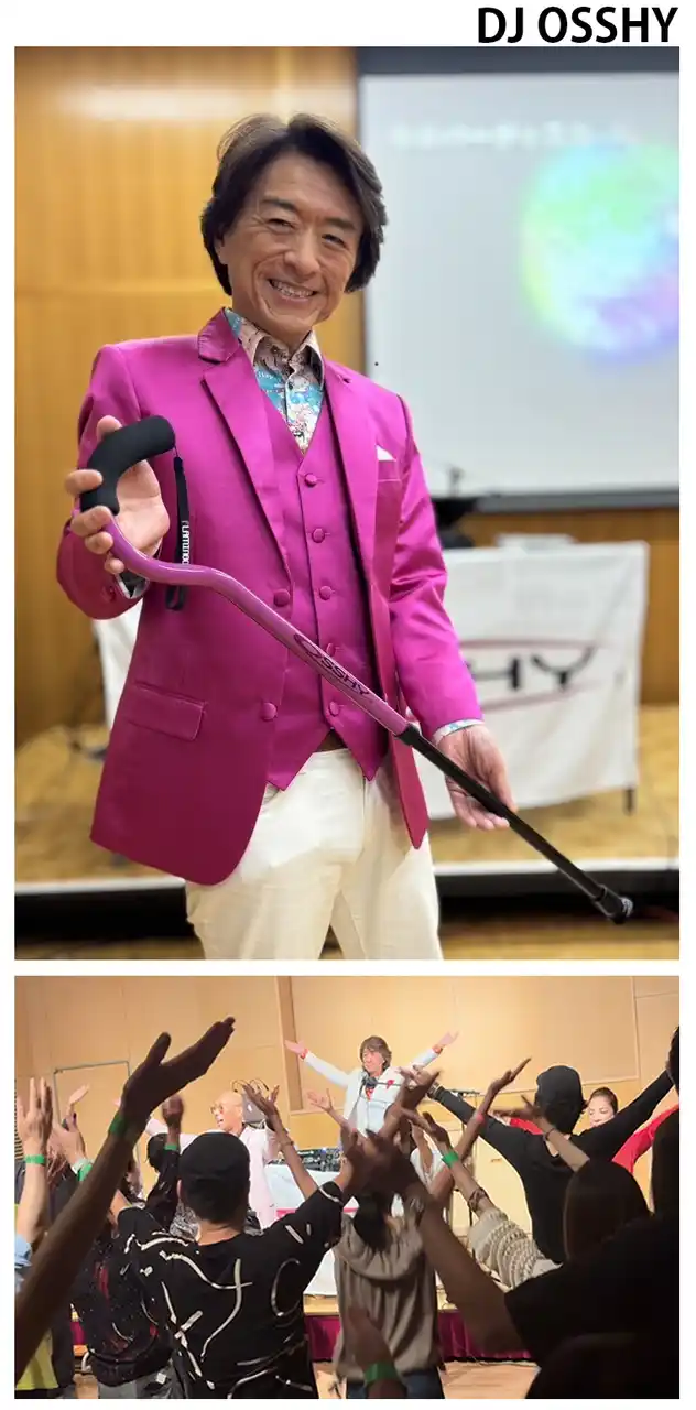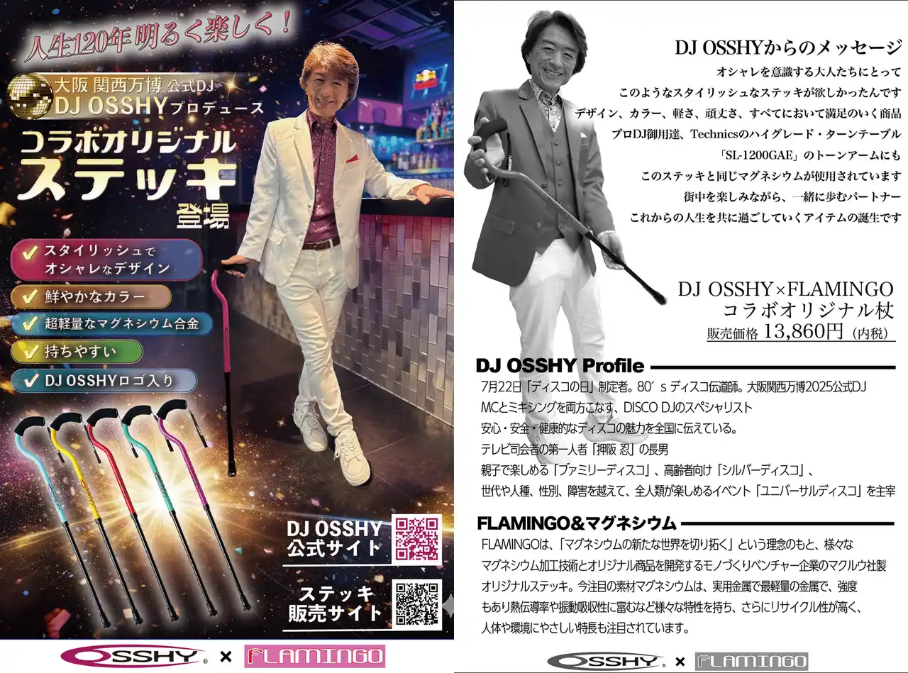 “人生120年時代”のメッセージとともにシニアを応援するディスコ&ラジオDJの第一人者・DJ OSSHY(株式会社エス・オー・プロモーション 代表取締役社長 押阪雅彦)と、マグネシウムの新たな未来を切り拓く注目のモノづくりベンチャー企業・株式会社マクルウのコラボ企画により昨秋誕生した 「DJ OSSHY-FLAMINGOコラボオリジナルステッキ」。シルバーディスコ・ユニバーサルディスコや高齢者施設でのディスコイベント等を開催するDJ OSSHYと、パラスポーツや子供向け車椅子等も手がけるマクルウ社の、楽しくオシャレに“安心・安全”をお届けする異色のコラボレーションで注目を集めています。 |