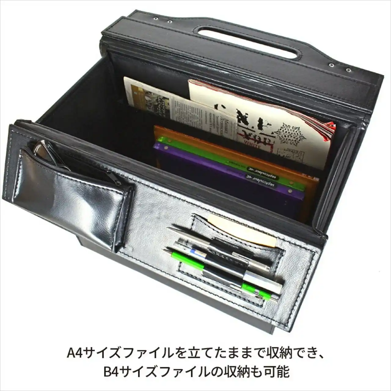 | 毎日の業務で欠かせない書類や資料、筆記具、小物類をまとめて持ち運べる収納力も大きな特長です。A4ファイルは立てたまま収納でき、B4サイズにも対応。前面のフラップ付きポケットは、よく使う資料や小物の出し入れに便利です。さらに内側にはペン差しや小物収納スペースを備えており、必要なアイテムをすっきり整理して持ち歩けます。 | |||||||||