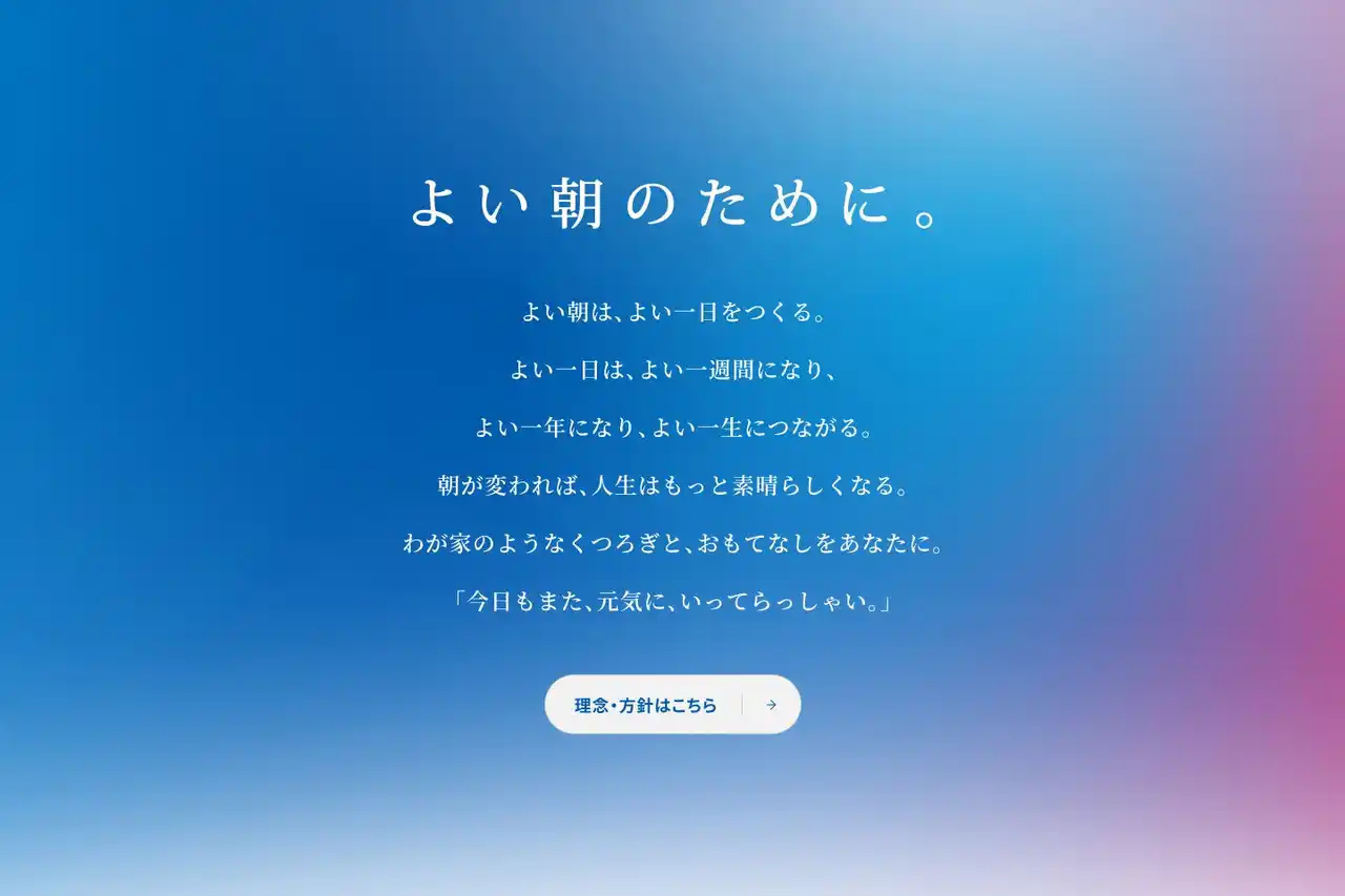 サイト全体を通し、コーポレートスローガン「よい朝のために。」を象徴するトーン&マナーを採用。企業の持つ「信頼感」と、お客様に寄り添う「親しみやすさ」を共存させたデザインへと進化させ、当社のアイデンティティを直観的に伝えます。 |
