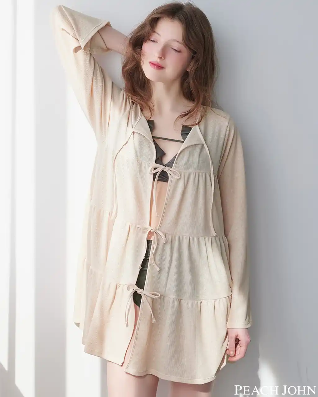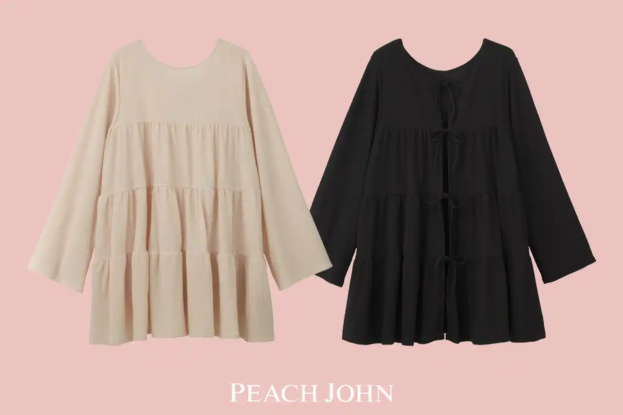 ティアードタイプは、リボンディテールとふんわりとしたティアードデザインがフェミニンな印象をプラス。前後を入れ替えて着用できる2WAY仕様で、気分やコーディネートに合わせて異なる表情を楽しめます。カラーはピーチピンクとブラックの2色展開。 |