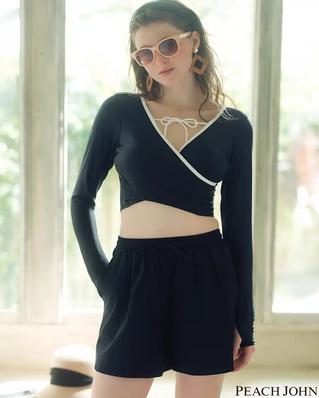トップス&ショートパンツタイプは、首元が深く開いたVネックのカシュクールデザイン。薄手のカップ付きで、一枚でも、水着の上から重ねても着用可能です。カラーはオフホワイトとブラックの2色展開。 |