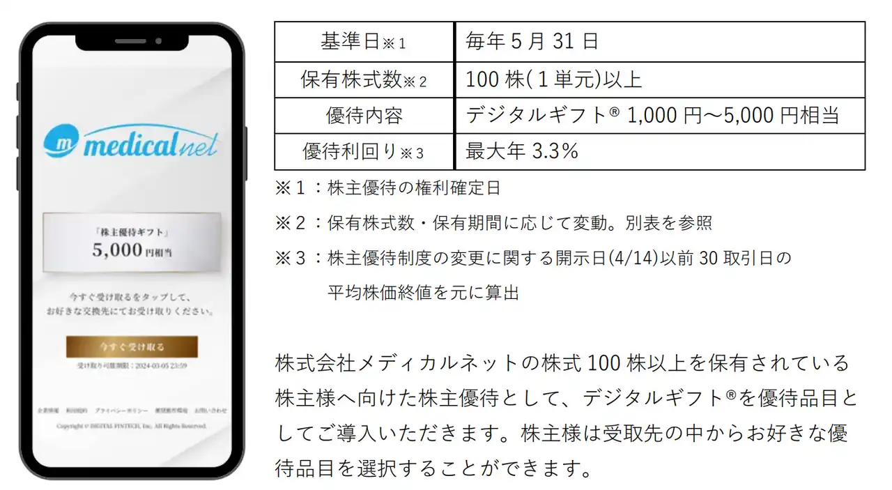 | 株式会社メディカルネット(代表取締役会長CEO:平川 大、東証グロース:証券コード 3645)において、株式会社デジタルプラス(代表取締役社長:菊池 誠晃、本社:東京都渋谷区、東証グロース市場:証券コード3691)グループが運営する「デジタルギフト(R)」を株主優待としてご活用いただくことになりました。 | ||||||||||||||
