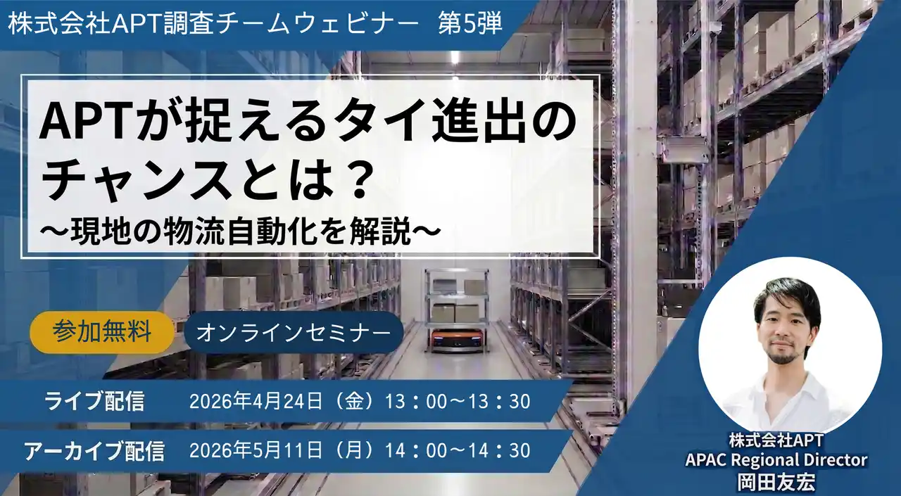 APT)は、2026年4月24日(金)に、オンラインセミナー「APTが捉えるタイ進出のチャンスとは?~現地の物流自動化を解説~」を開催いたします。