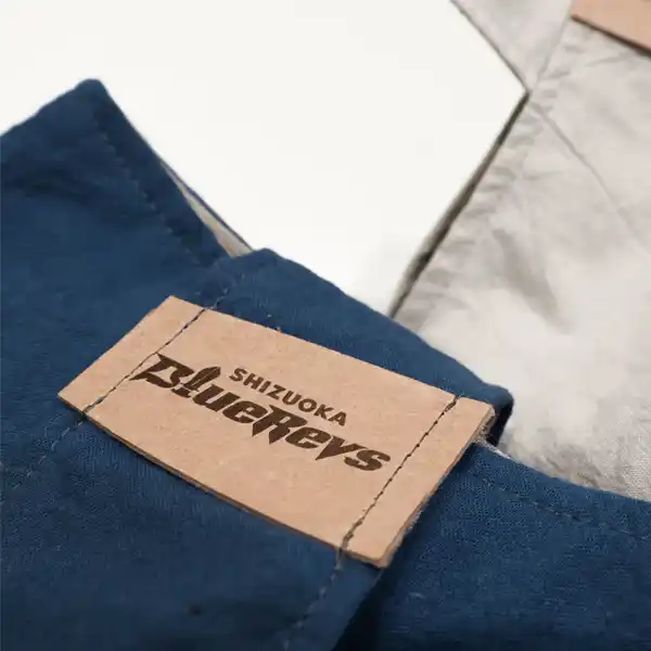 アクセントには、天竜地域で採取された野生鹿を活用したジビエレザーを使用。職人の手仕事によって鞣されたレザーには、静岡ブルーレヴズのロゴを刻印し、サングラスやペンなどを差し込める実用的な仕様に仕上げました。 |