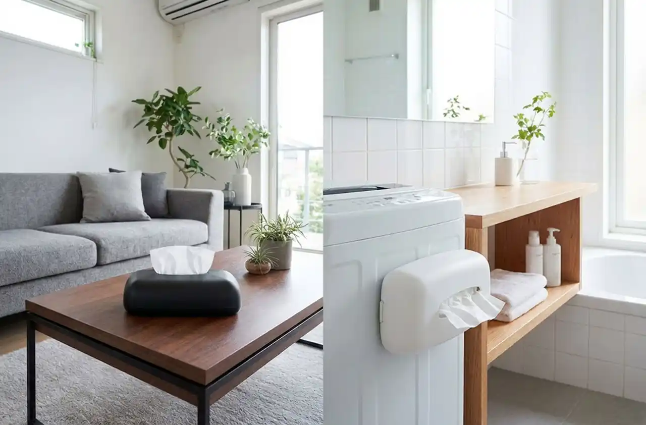 「ここにティッシュがあったら便利」という場所や、今まで空いていたデッドスペースもティッシュの定位置として活用できます。 |