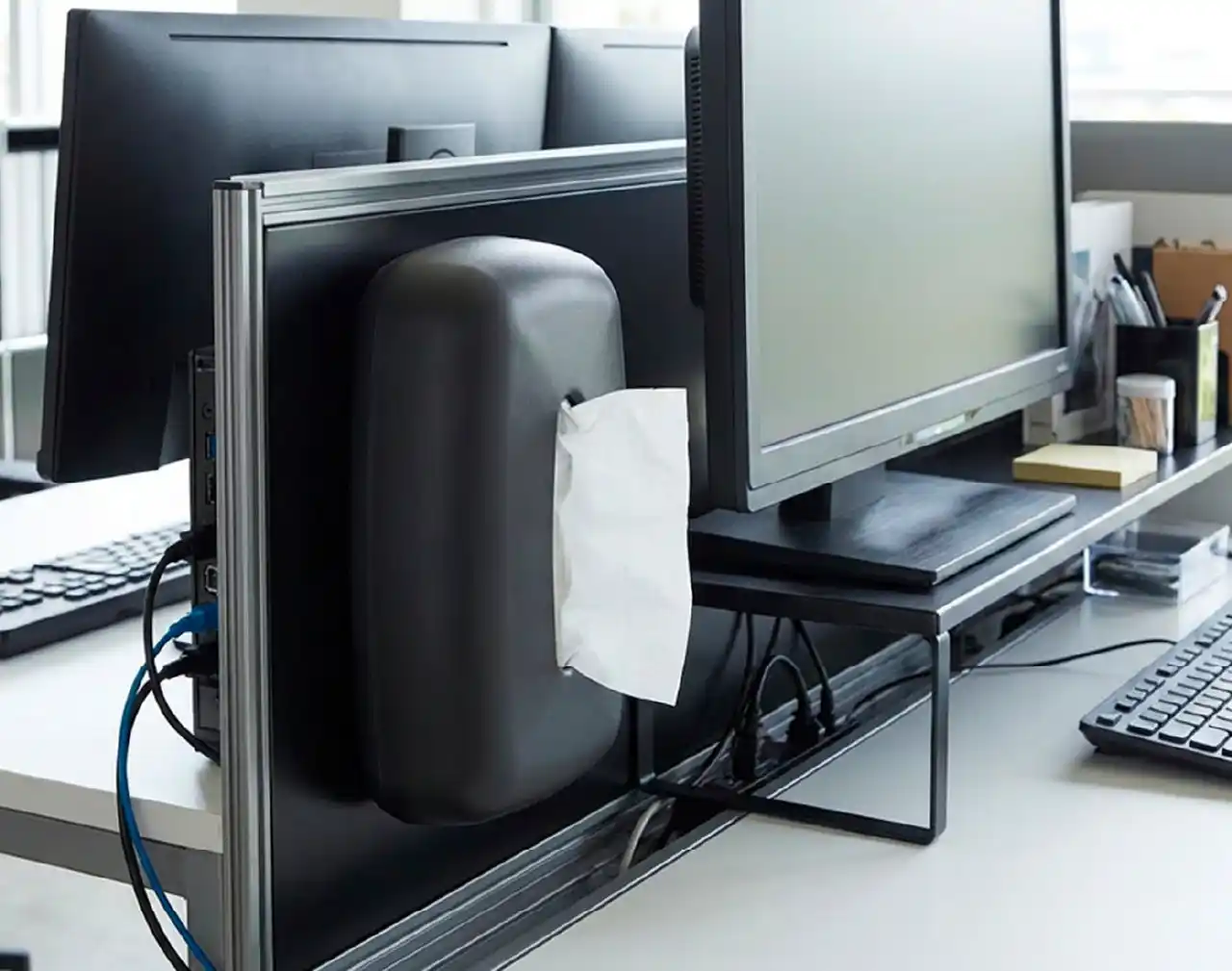 デスクに箱ティッシュを置くと、意外と場所を取ります。 スチールパネルやラックに取り付ければ、デスクのスペースを広く使えます。 |