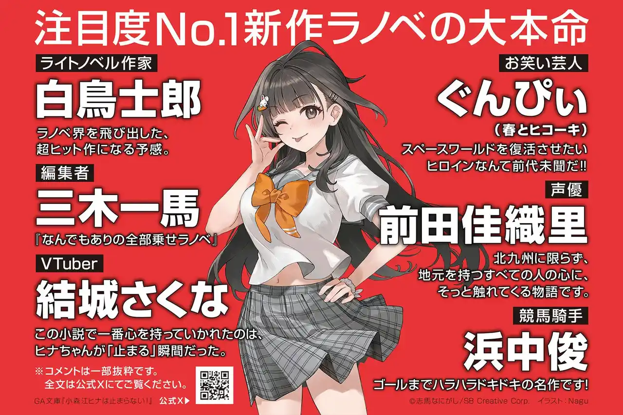 | SBクリエイティブ株式会社(本社:東京都港区、代表取締役社長:木崎 秀夫)が展開するライトノベルレーベル「GA文庫」は、新作ライトノベル『小森江ヒナは止まらない!』を刊行します。本作は、アニメ化およびドラマ化で大きな話題を呼んだGA文庫大賞<大賞>受賞作『透明な夜に駆ける君と、目に見えない恋をした。』の著者・志馬なにがしによる待望の最新作です。 情報解禁直後から熱い反響をいただき、異例の「発売前重版」が決定しました。 | ||||||||||||||||||||||||||