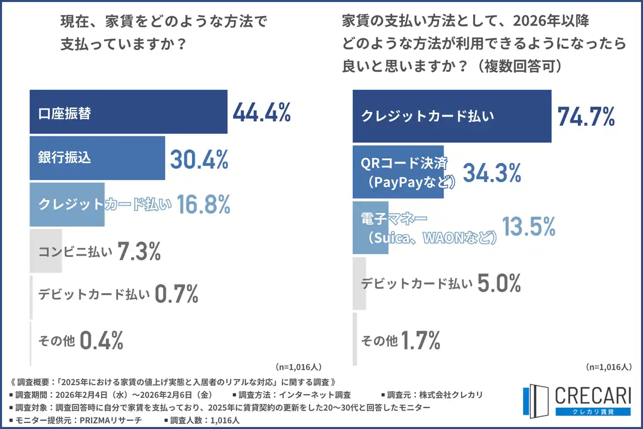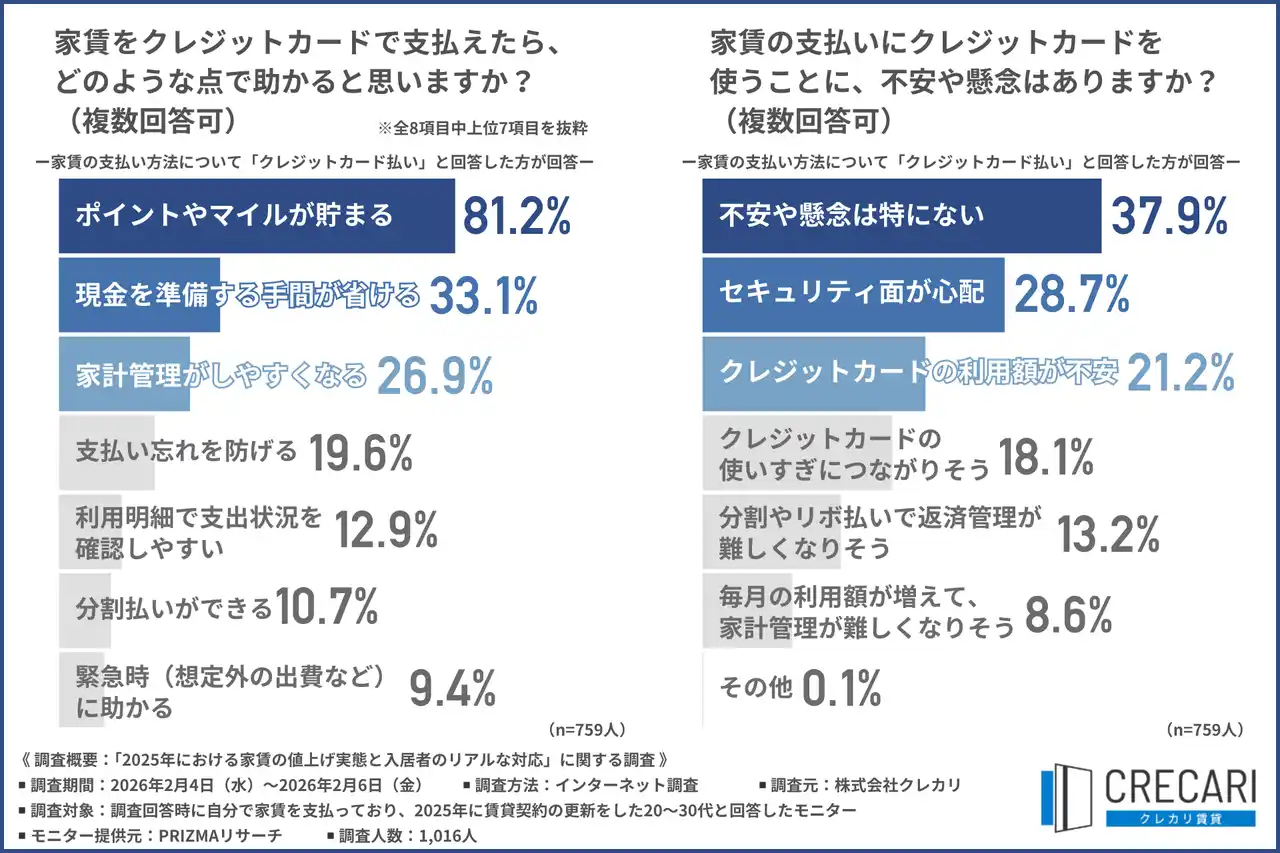 今回、「2025年における家賃の値上げ実態と入居者のリアルな対応」に関する調査を実施した株式会社クレカリ(https://crecari.com/)は、家賃をクレジットカード払いにできるサービス「クレカリ賃貸」を提供しています。 |