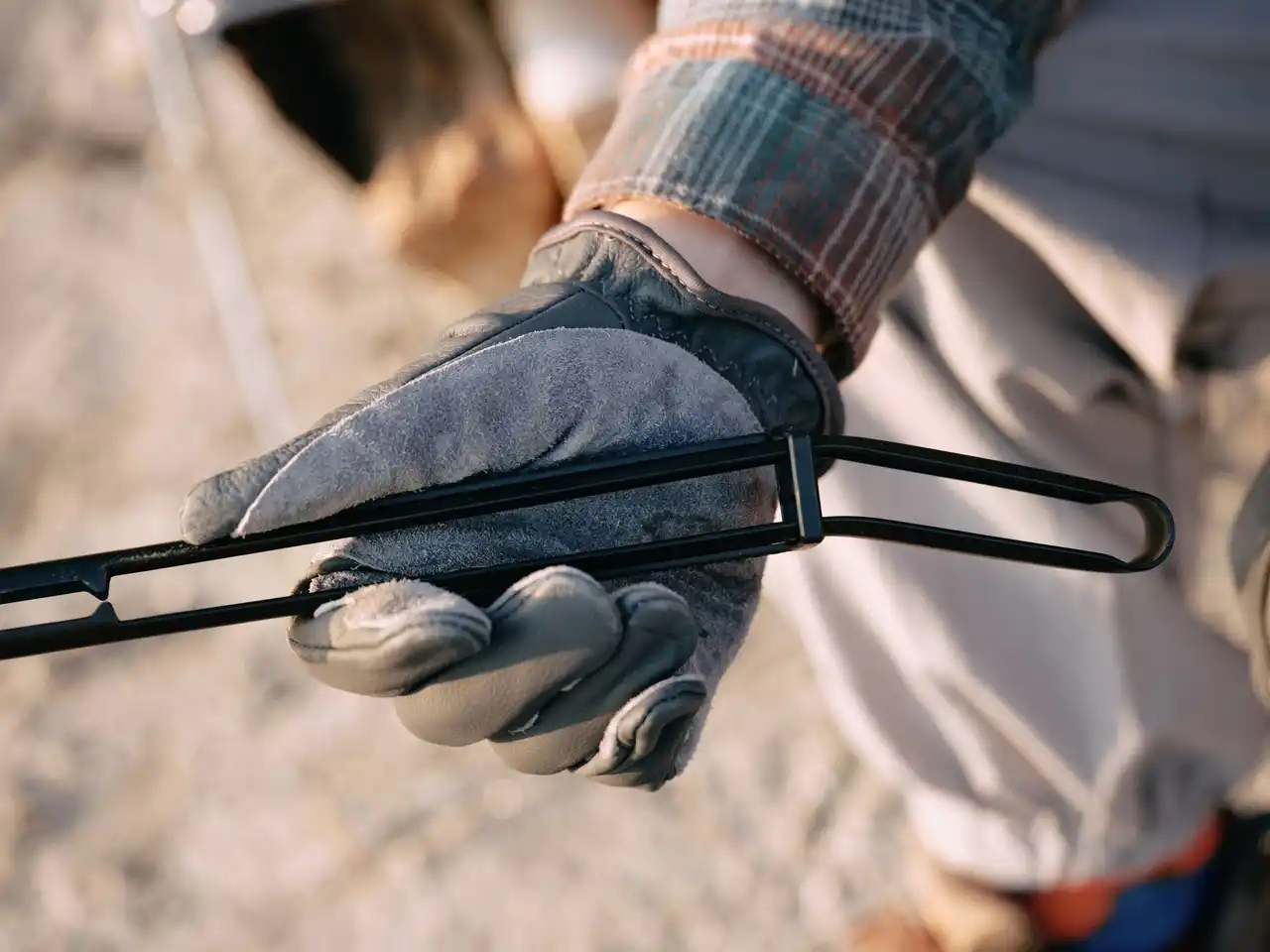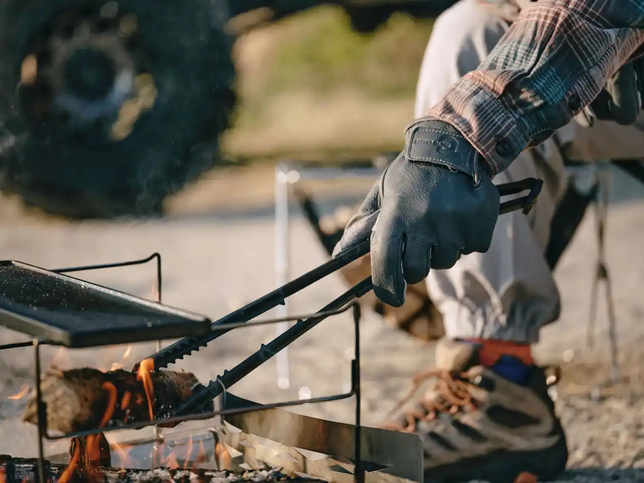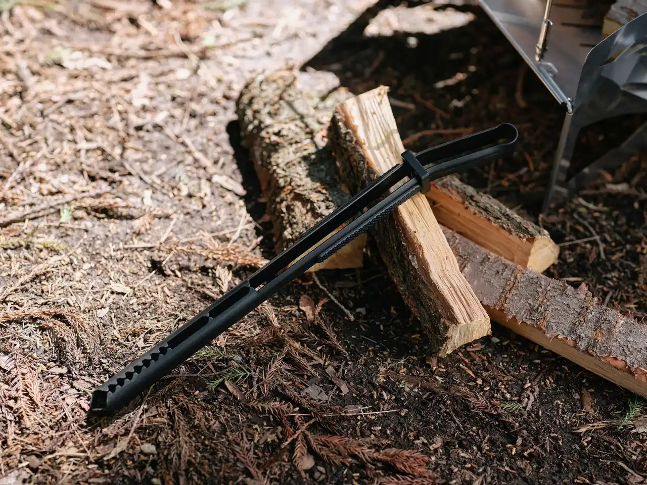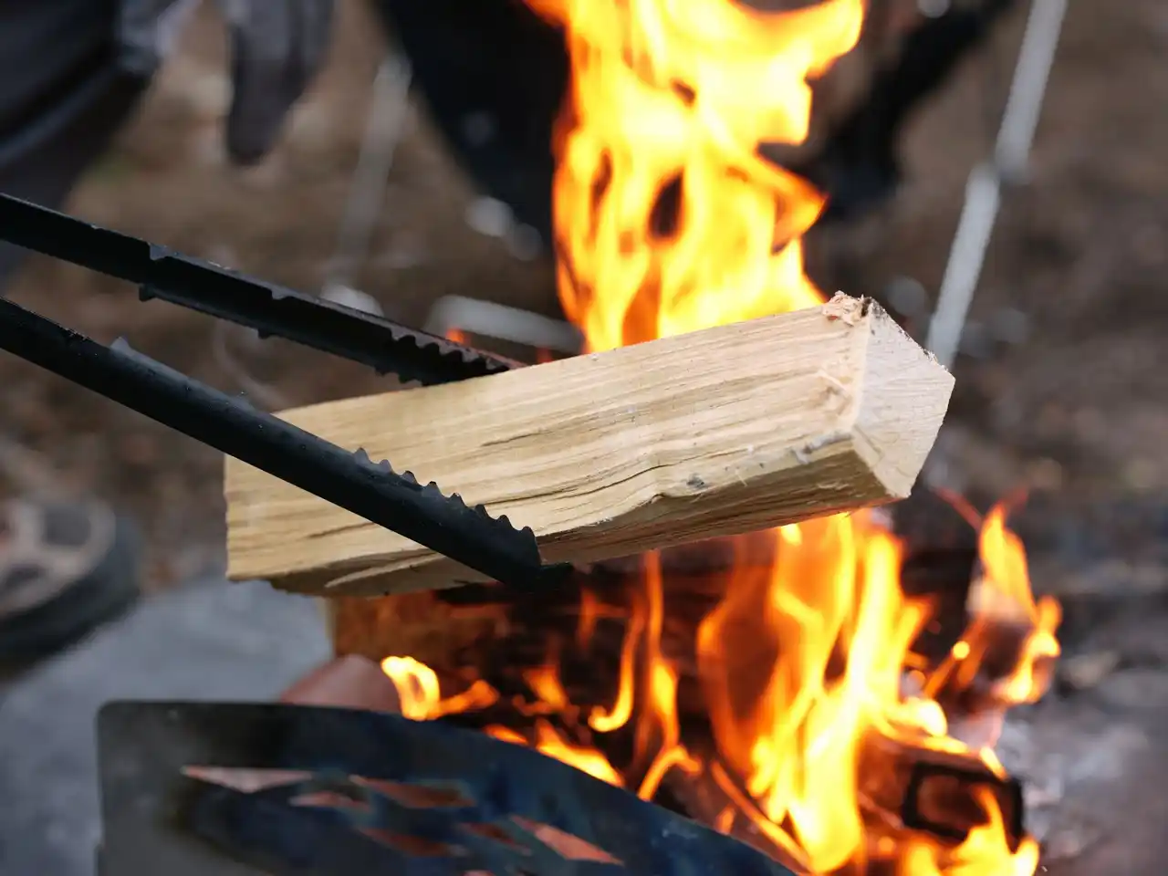 焚き火における薪の操作性と安全性を高めるために設計された火バサミ。 |