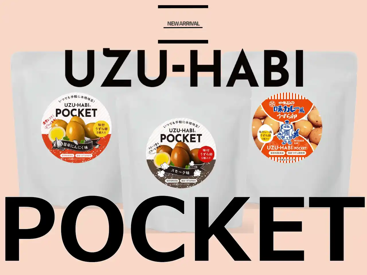 「おでん缶」などを製造販売する天狗缶詰株式会社(本社:愛知県、代表取締役社長:伊藤 圭太郎)は、国産うずら卵の新しい需要を掘り起こすブランド「UZU-HABI(ウズハビ)」から、新シリーズ「UZU-HABI POCKET」を4月15日(水)より展開します。(株)大和製菓とコラボした「味カレー風」、「スモーク味」、「旨辛にんにく味」の3種類を新発売いたします。 |