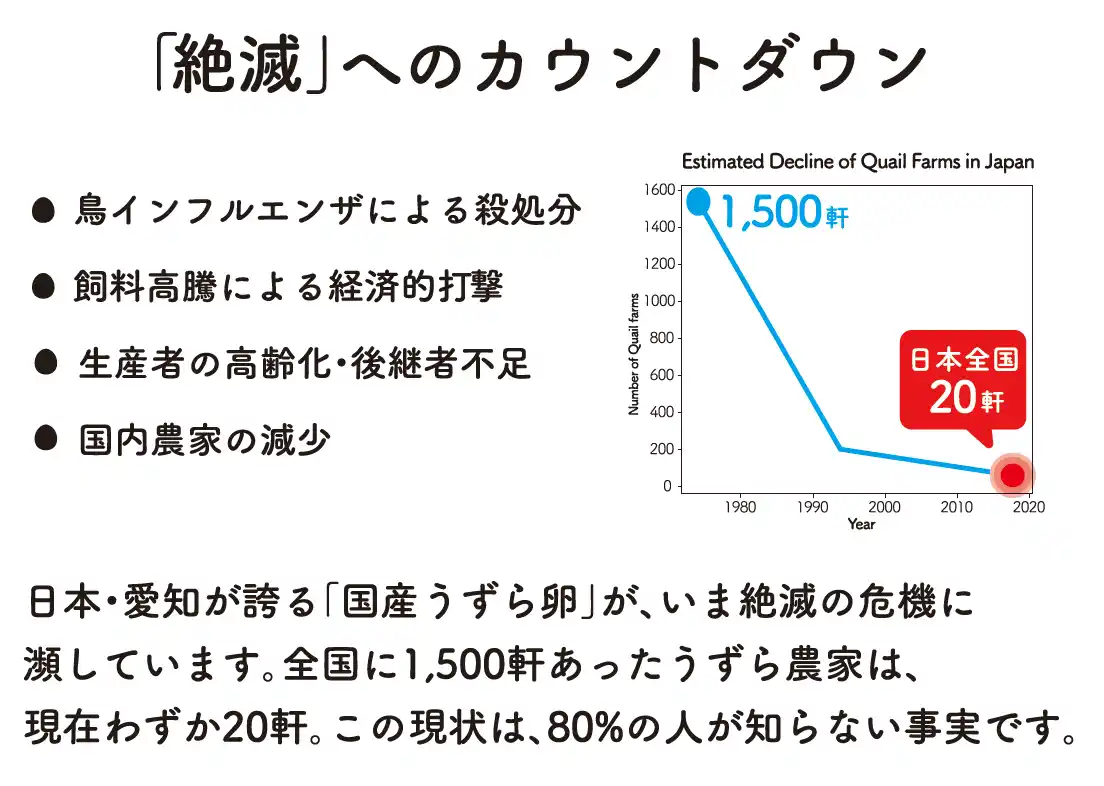 鳥インフルエンザによる殺処分や、誤嚥事故による使用控えの影響が大きく、高齢化や後継者不足といった他の産業と同じ問題も抱えています。将来を悲観して廃業を選択されるうずら農家もおられ、このままでは国産うずら卵の産業そのものが衰退しかねません。事実、この30年で愛知県豊橋市に42戸あったうずら農家は、わずか5戸となっています。 |
