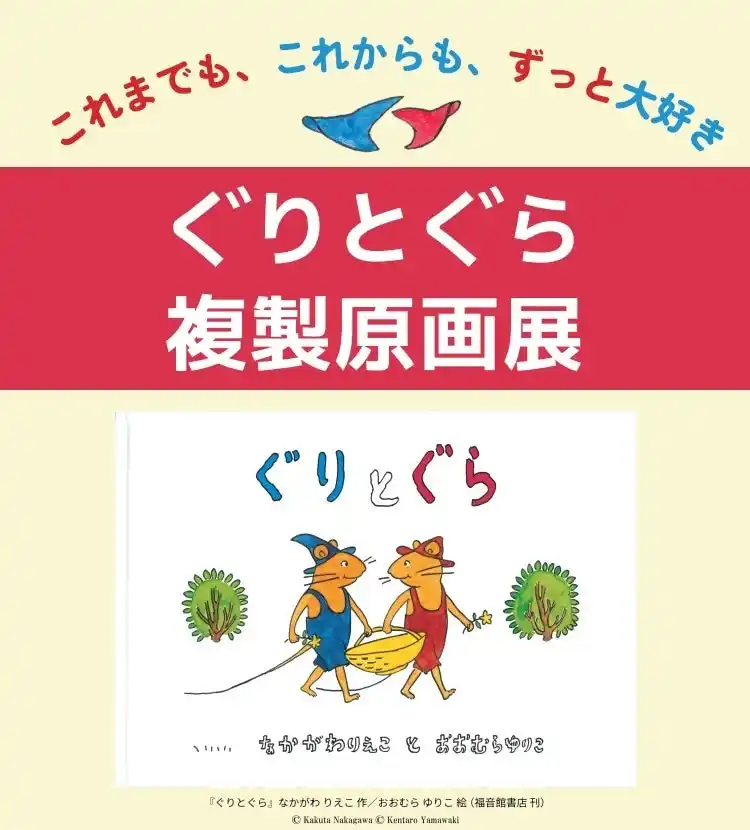 オープンを記念し、福音館書店を代表する作品『ぐりとぐら』の複製原画展を開催いたします。世代を超えて読み継がれてきた名作の原画を間近でご覧いただける貴重な機会となっており、作品の魅力や世界観をより深く体感できます。 |