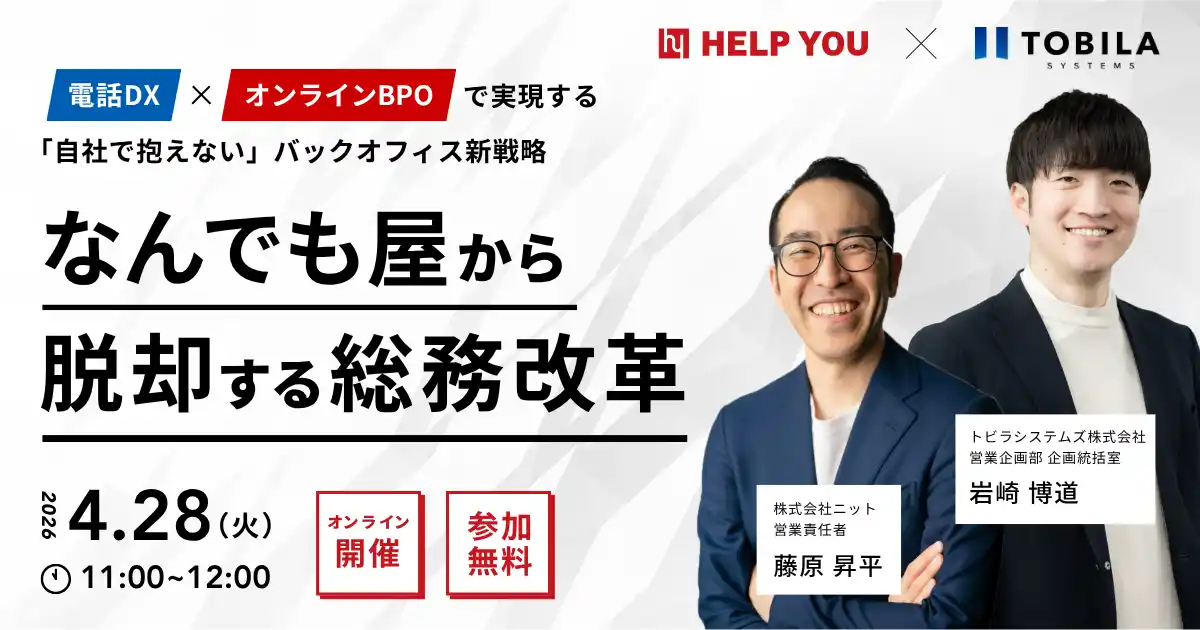 またその後工程に残る総務業務の構造も整理し、オンラインBPOの「HELP YOU」を活用した【自社で抱えない】バックオフィスの新しい在り方を解説します。 |