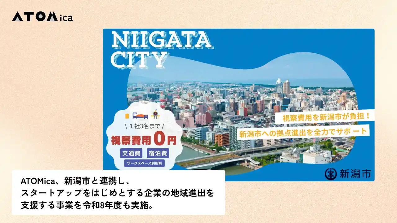 | 株式会社ATOMica(本社:宮崎県宮崎市、代表取締役Co-CEO:嶋田 瑞生、南原 一輝、以下「ATOMica」)は、新潟市と連携し、「新潟市企業誘致促進事業@新潟サテライトオフィス」を令和8年度も実施いたします。 | |||||||||||||||