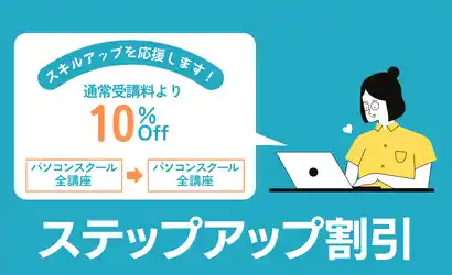 パソコンスクール内の講座を続けて受講する際に使える割引制度「ステップアップ割引」(受講料10%OFF)で、継続学習をサポートします。 |