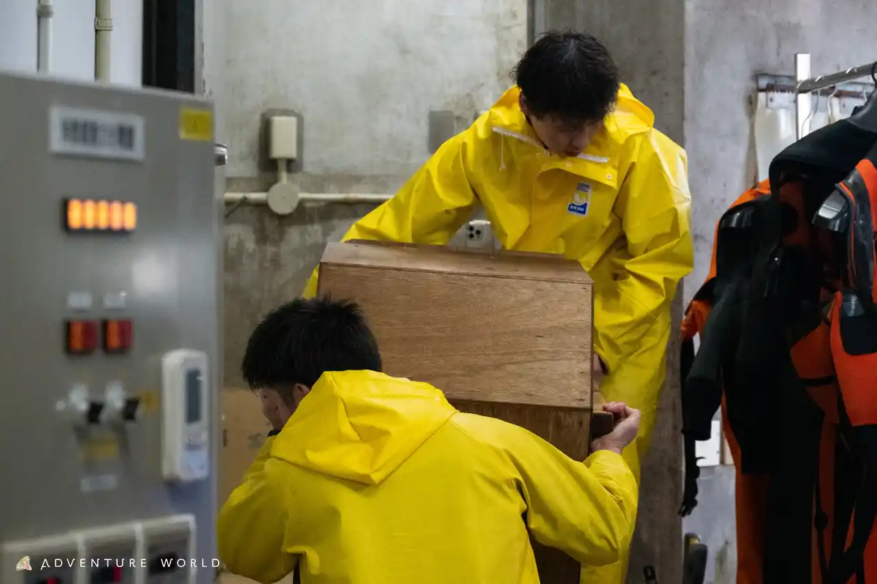 | 本日午前10時20分頃、まずは体重測定を実施。その後、いよいよ引越しが始まりました。 アニマルエデュテイナー(飼育スタッフ)の誘導を受けると、「44番」は戸惑う様子を見せることなく、スムーズに移動専用の木製箱の中へ。 | ||||||||||||||