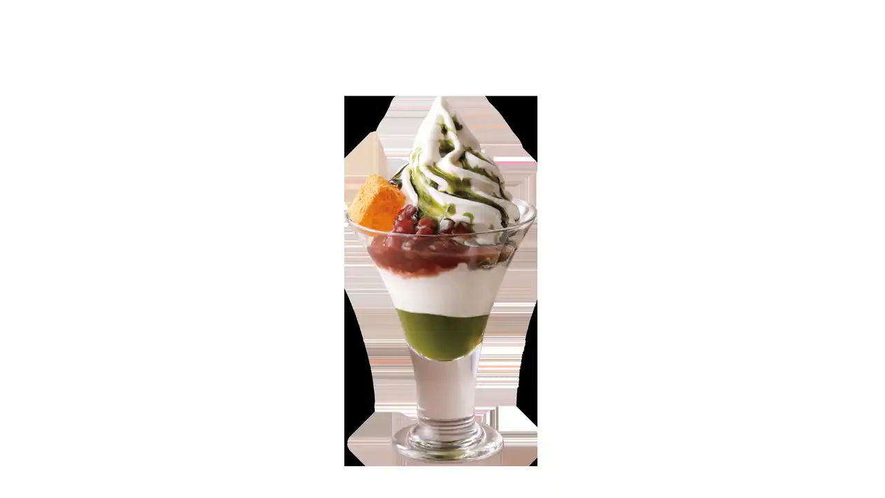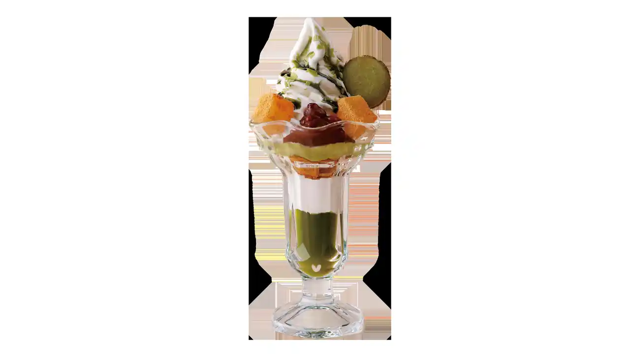北海道産ソフトクリームと抹茶クリームに加え、わらび餅、ゆであずき、ぷるぷるの抹茶ゼリーがのったほんのり香る抹茶の風味と色々な食感が愉しめる和風パフェです。 |