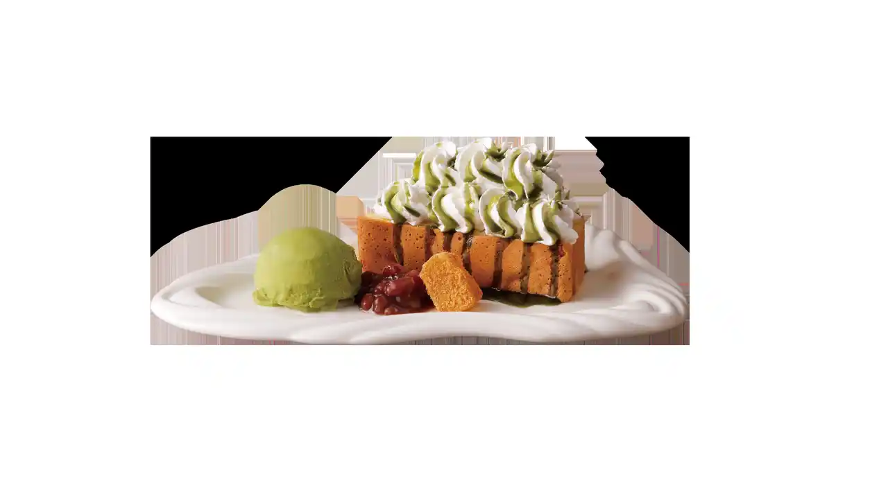 ふわふわでしっとりとしたシフォンケーキにホイップクリームと抹茶ソースをあしらい、抹茶アイスやわらび餅を添えた、上品なケーキデザートです。びっくりドンキーこだわりのコーヒーと一緒に味わえるセットもお選びいただけます。 |