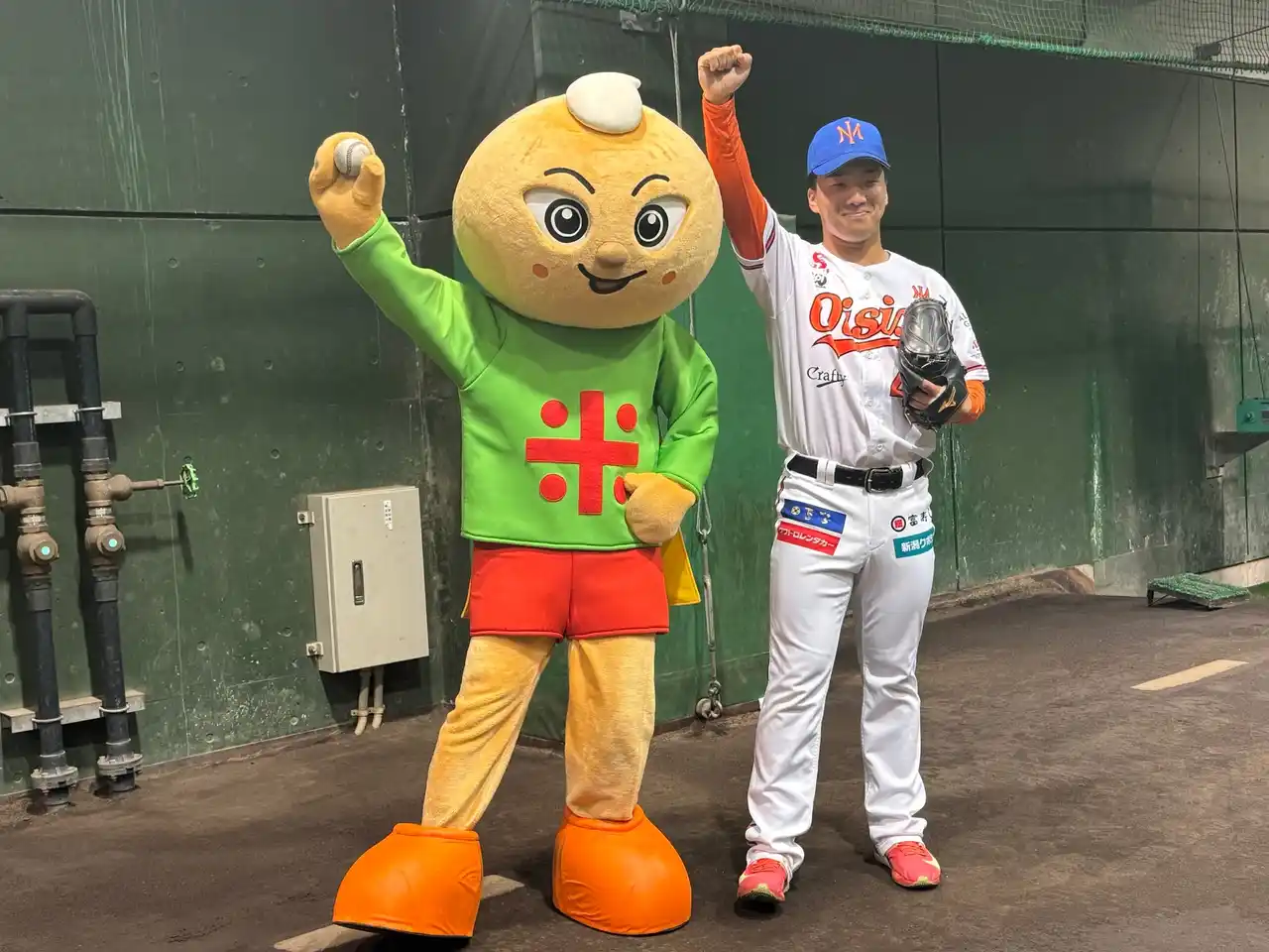 ▲始球式に参加したコメパンマンと新潟県出身の高橋駿臥選手 |