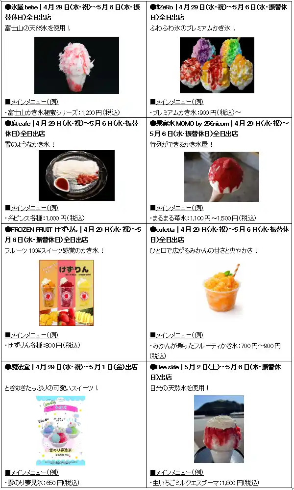 イベント期間中、昨年大人気だった富士天然氷を使ったかき氷やSNSで注目を集めているかき氷、スイーツ感覚で楽しめるかき氷など多様なメニューを展開します。 |