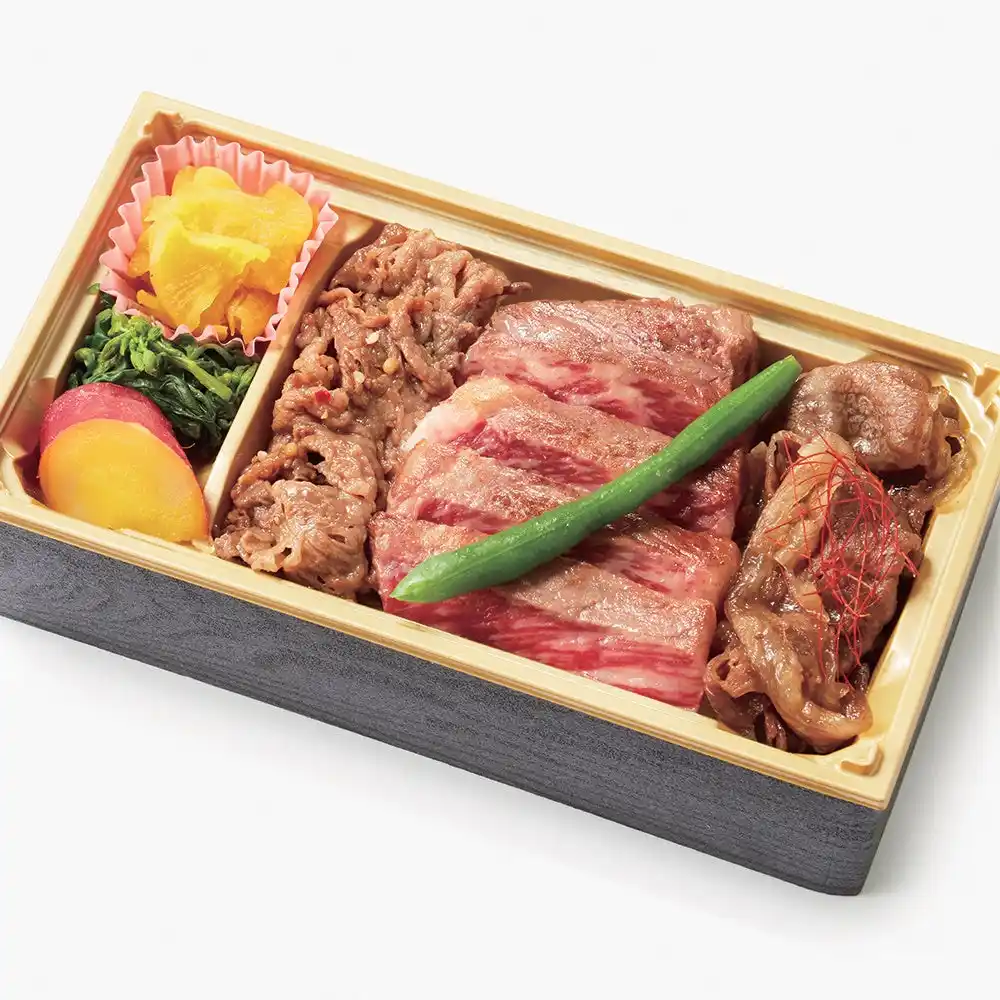 ジューシーなサーロインステーキ、ロース肉のすき焼きに加え、焼肉も楽しめる贅沢なお弁当です。 |