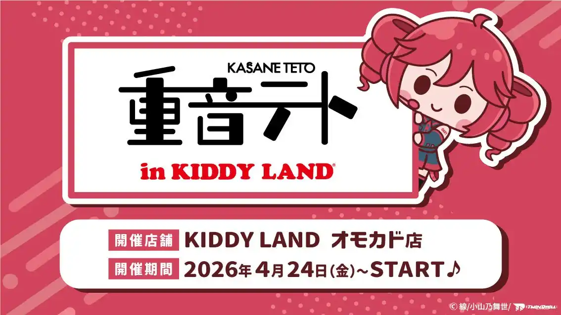 P&J株式会社は、株式会社キデイランド(本社:東京都千代田区、代表取締役社長:津村孝彦)の協力運営のもと、バーチャルシンガー『重音テト』のポップアップショップを 2026年4月24日(金)より、キデイランドオモカド店にて開催いたします。 |