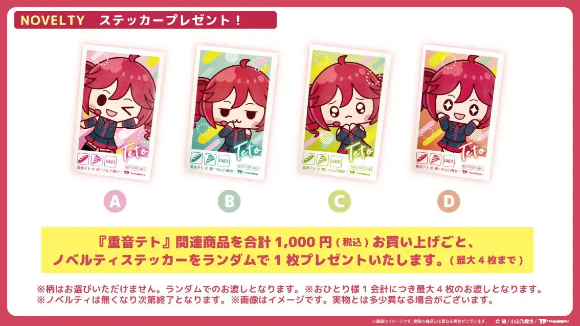 『重音テト in KIDDY LAND』限定ノベルティステッカーをランダムで1枚プレゼントいたします。(最大4枚まで) |