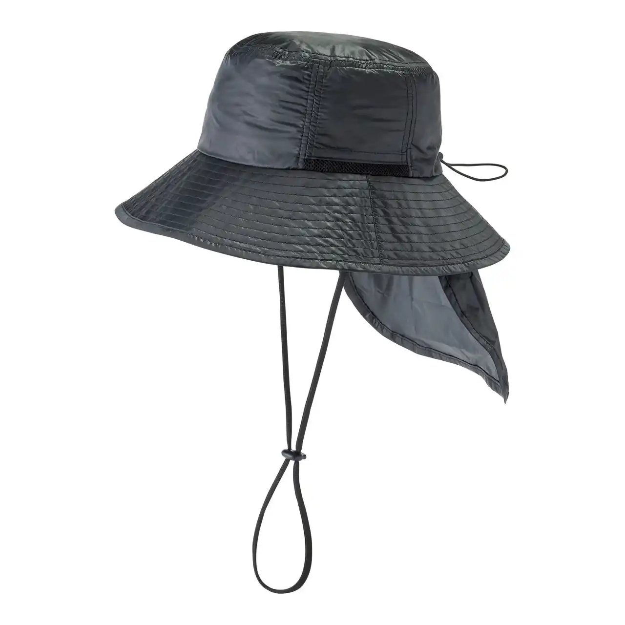 遮光・UVカット・遮熱・はっ水性を兼ね備えた傘生地を使用した遮光ハット。つば裏に収納できるネックガード付き。 |
