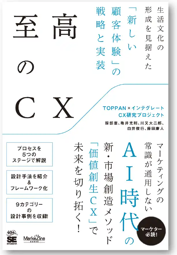 | 株式会社インテグレート(本社:東京都渋谷区、代表取締役CEO:藤田康人、以下、インテグレート)は、TOPPAN株式会社との共同プロジェクト「TOPPAN × インテグレート CX研究プロジェクト」において集積した知見をまとめた書籍『至高のCX 生活文化の形成を見据えた「新しい顧客体験」の戦略と実装』を、5月25日(月)に株式会社翔泳社より刊行いたします。 | |||