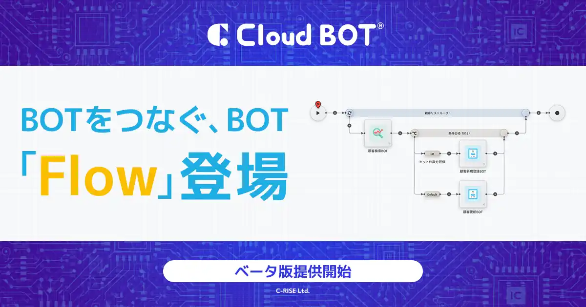 株式会社C-RISE(本社:富山県高岡市、代表取締役:村井 将則)は、クラウド型のRPAサービス「クラウドBOT(R)」において、複数のBOTを繋いで一つのワークフローを作成できる新機能『Flow』のベータ版をリリースしたことをお知らせいたします。 |