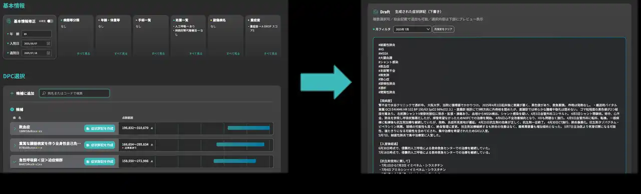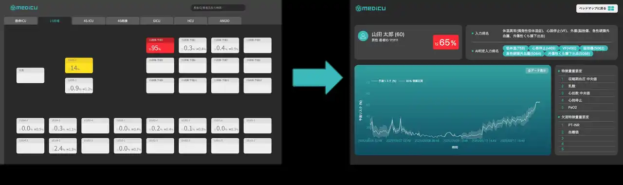 同モデルは2025年8月より関西医科大学総合医療センターで実証導入を行い、臨床現場での医師の判断の補助において安全性や精度が実証されたため、この度、MeDiCU-AI“退室・転棟支援プログラム”として2026年4月より正式に導入されることとなりました。また、実証導入中に症状詳記のドラフトをAIが作成する“症状詳記作成支援プログラム”も開発。両プログラムを活用することで、より高度な医療サービスの提供および医療従事者の負担軽減へと繋がることが見込まれます。 |