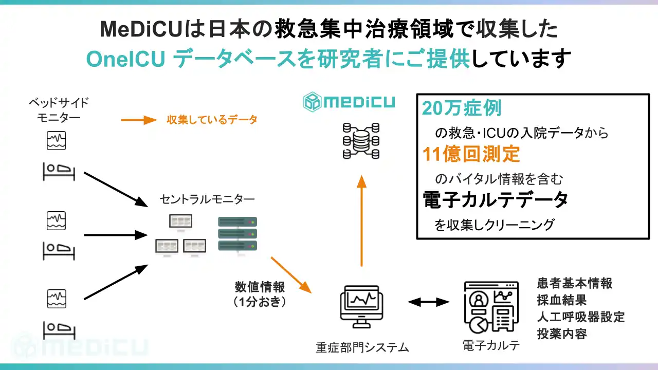 関西医科大学とMeDiCUは「生体情報を用いた急変イベント予測モデルの作成およびその有用性を検討する多施設後ろ向き研究」に関する共同研究を2024年より行っています。日本全国の39の大学病院や市中中核病院のICU(集中治療室)が参加するこの多施設研究では、約20万症例(※2)の生体情報や血液検査、薬剤情報等を収集した“OneICUデータベース”を構築、既に多数の学術論文や学会発表で研究成果が報告されています。さらに、MeDiCUは、“OneICUデータベース”を用いて救命救急センター・ICUに入室する患者さんの一般病棟への転棟の判断を支援するAIを開発。そのモデルが既存の指標よりも高い精度で患者さんの状態を把握できることを明らかにしてきました。 |