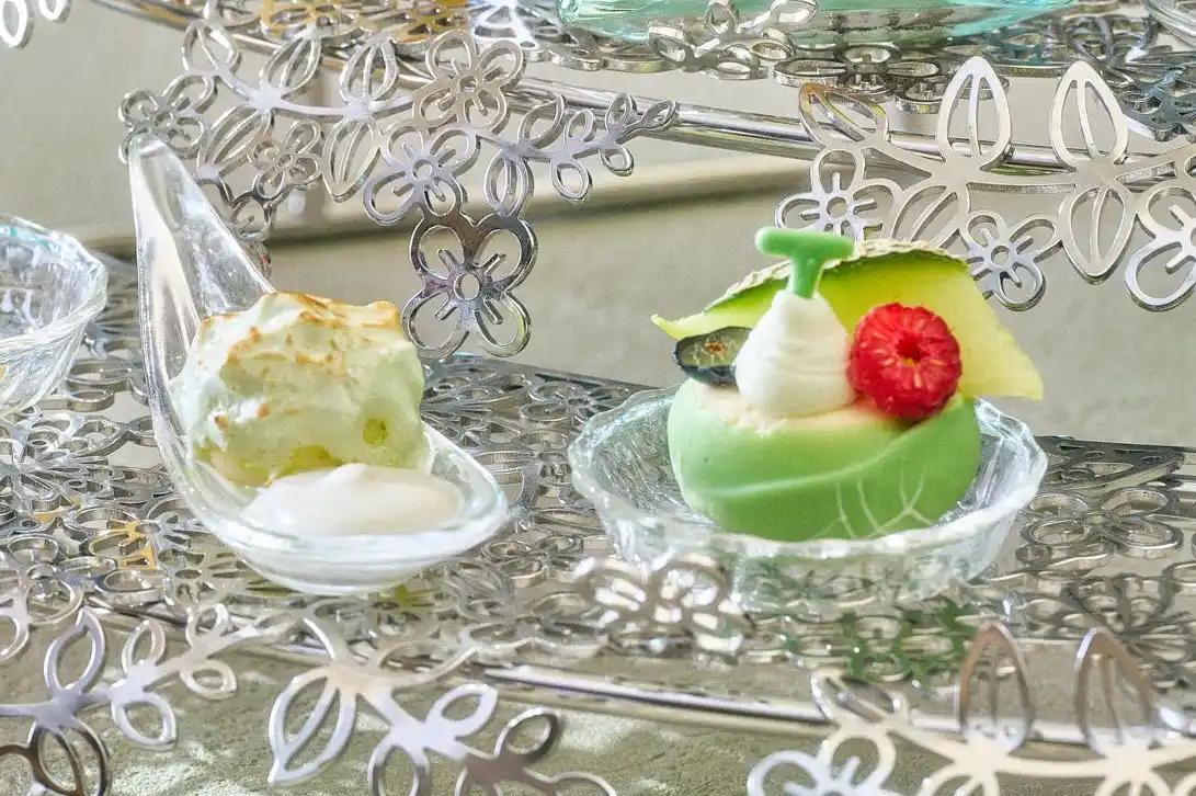 スイーツは全9種をご用意。 爽やかな味わいの「杏仁メロン」や、生姜のほのかな辛みを効かせた「マンゴー生姜ゼリー」、サクッとした食感の「メロンムース メレンゲ包み」などの初夏らしい軽やかなメニューが揃います。さらに、王道のショートケーキ、可憐な「花かごシュークリーム」も並び、ティータイムを華やかに彩ります。 |