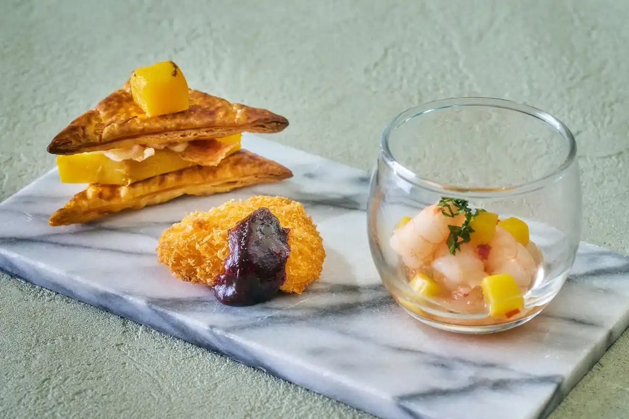 パイ生地のミルフィーユピザ マンゴーのグリル/小海老とマンゴーのマリネ オリエンタル風/チーズフライ イチゴのコンポート添え |