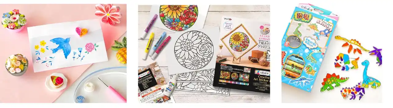 海野ちなみ」、水性クレヨン「カラリックスシルキーツイスター」等、多数の商品を取り揃えます。ブース内では、例年通り細長い紙を巻いて作る「ペーパークイリング」パーツ作り体験を行う他、9日・10日は主にご家族連れを想定した「グラスデコ