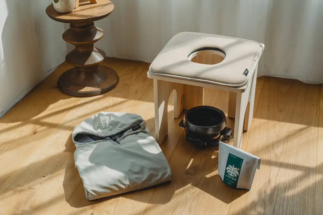 よもぎをはじめとした薬草やハーブを煮出し、立ち上る蒸気を下半身から取り入れることで、からだを芯から温め、めぐりを整える「よもぎ蒸し」。約600年前から続く伝統的な温熱ケアを、自宅で日常的に続けられるよう再設計したのが、wamcaの「自宅よもぎ蒸し用スターターセット」です。換気ができる畳半畳ほどのスペースがあれば、リビングでも脱衣室でもどこでも利用できます。 |