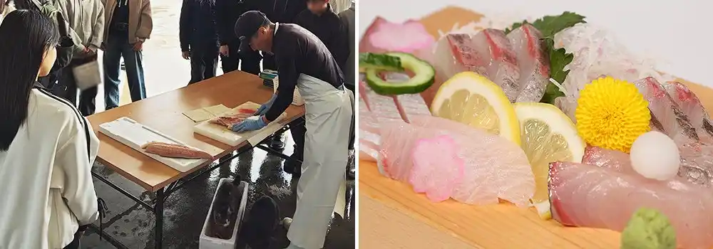 3つ目のプログラムは「ブランドかんぱちのさばき方体験&試食」です。垂水市が誇るブランドかんぱち「海の桜勘」を、自分の手でさばき、その場で味わうことができます。 |