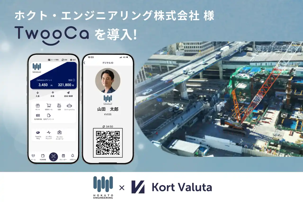 株式会社Kort Valuta(本社:東京都渋谷区、代表取締役:柴田秀樹、以下「当社」)は、ホクト・エンジニアリング株式会社(本社:東京都葛飾区、代表取締役:石井金徳、以下「ホクト・エンジニアリング」)へ、福利厚生の一元化および従業員の健康管理の高度化を目的として、次世代型*1ウォレット「TwooCa(ツウカ)」を提供し、導入されたことをお知らせします。 |