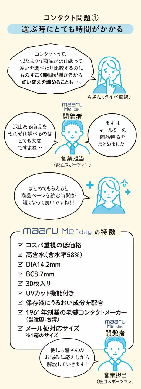 「今回のプロジェクトが発足したきっかけは、メンバー自身の苦い経験でした。初めてコンタクトを買おうとした際、専門用語の壁にぶつかり、結局どれが良いのか分からず数時間を無駄にしてしまったのです。『なぜこんなに疲弊しなければならないのか』。その疑問が、本製品のコンセプトになりました。 |