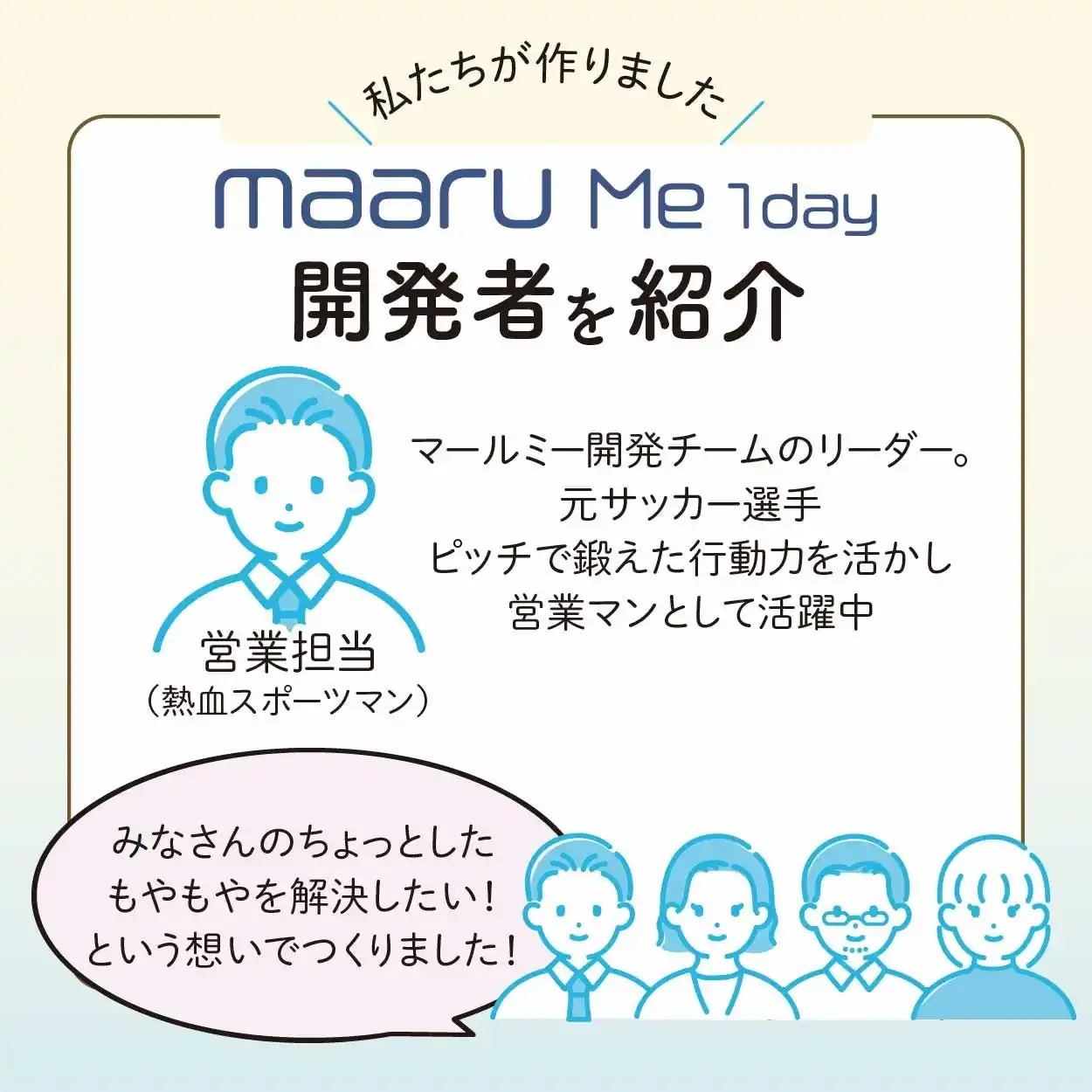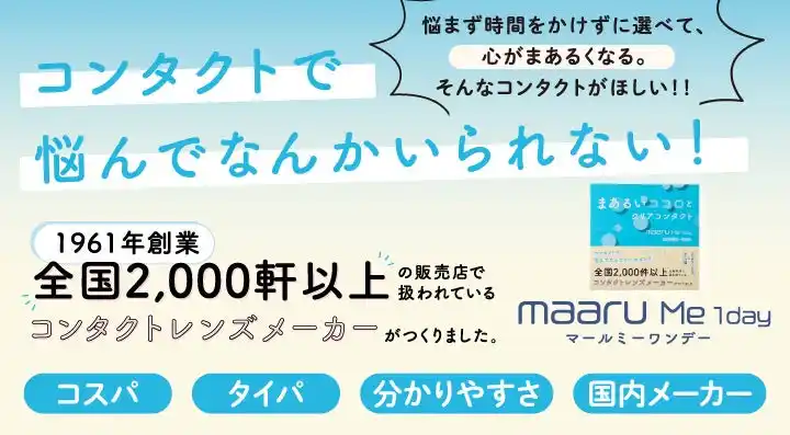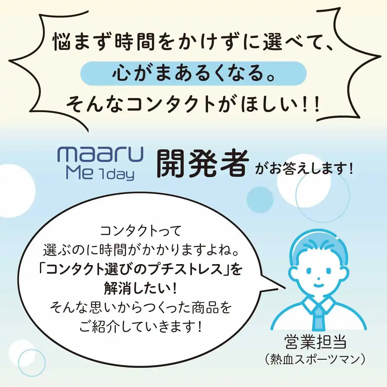 ブランド名の「マールミー(maaru Me)」には、コンタクト選びの分かりにくさにイライラして「とげとげ」してしまった心が、迷わずスマートに買い物ができることで「まあるく(円く)」なってほしい、という願いが込められています。 |