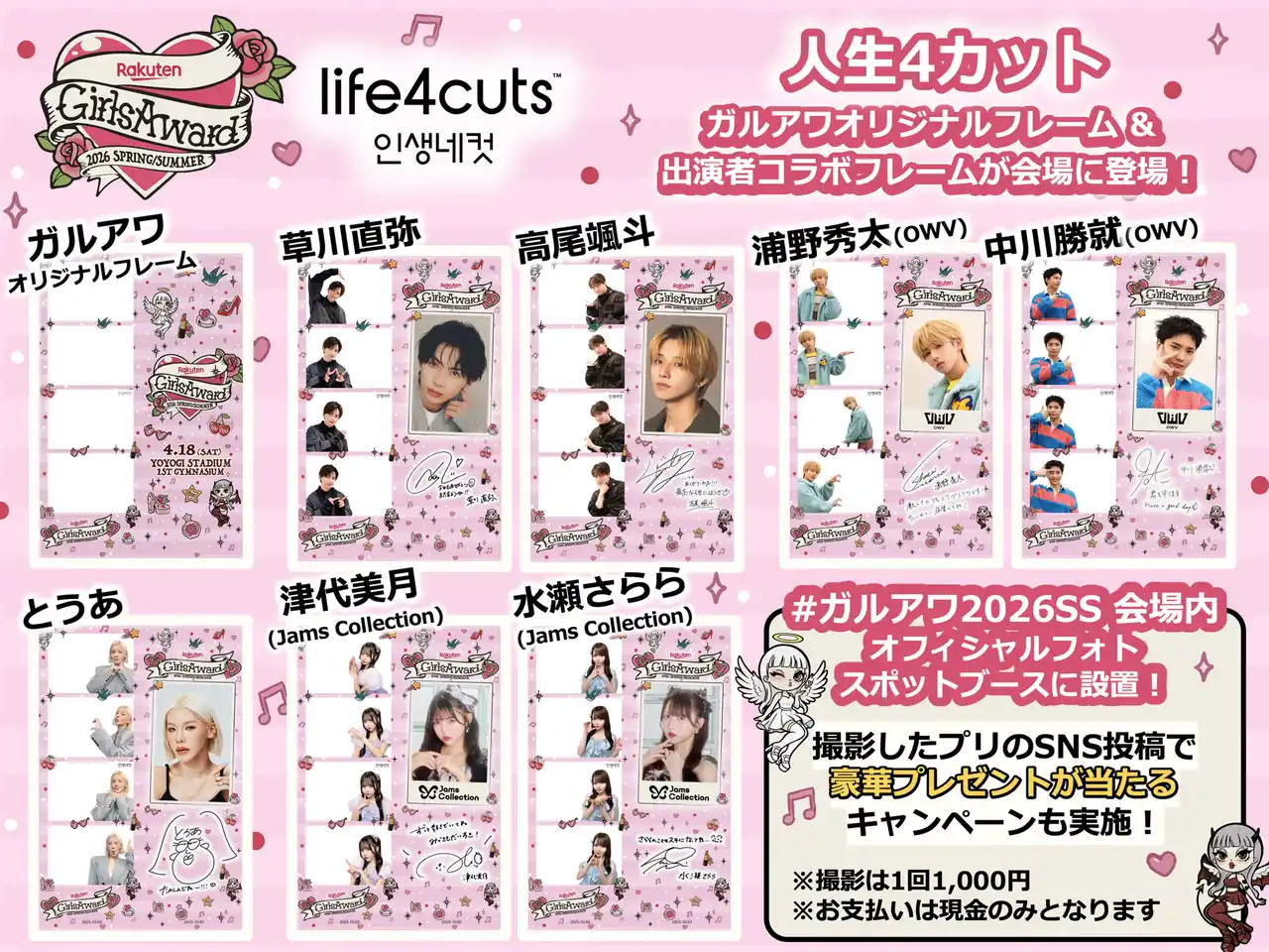 | 韓国プリ「人生4カット」では、今回のキービジュアルを使ったオリジナルフレームで撮影できるほか、草川直弥さん、高尾颯斗さん、OWVの浦野秀太さん、中川勝就さん、とうあさん、Jams Collectionの津代美月さん、水瀬さららさんのガルアワ限定コラボフレームでの撮影も可能です。 | |||