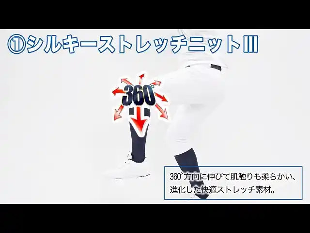 本製品には、新素材「シルキーストレッチニットIII」を採用。最大の特長は、野球のあらゆる動きに追従する、360°全方向へバランスよく伸縮する優れたストレッチ性です。この高いストレッチ性能により、ストレスフリーな着心地を実現し、プレーヤーの快適なプレーをサポートします。