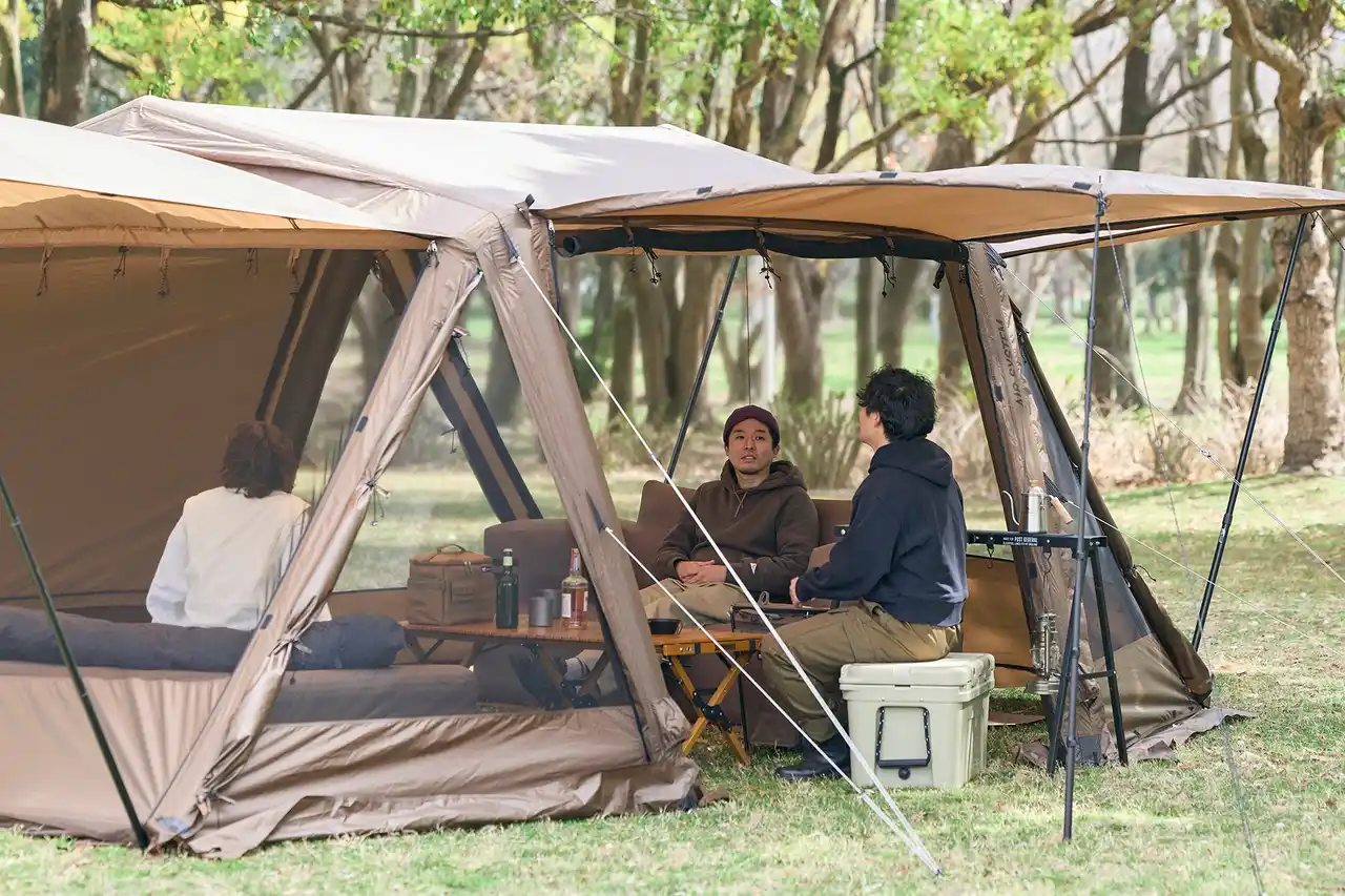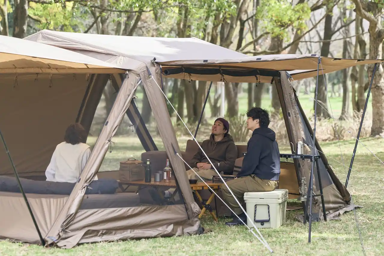 | 本製品は、大型テントならではの快適な居住性を備えながら、空気を入れて設営できるエアフレーム構造を採用したモデルです。設営時の負担を軽減し、より手軽にキャンプを楽しめるテントとして開発いたしました。快適な居住空間と扱いやすさの両立を目指し、設営や撤収の負担を抑えることで、キャンプ本来の楽しみである“外で過ごす時間”をより豊かにする一張りに仕上げています。 | |||||||||