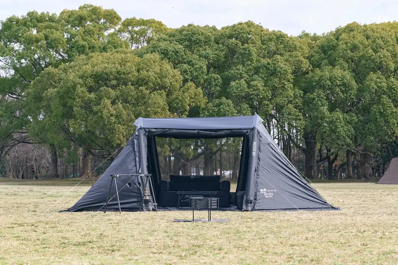| 快適な居住空間と、空気で立ち上がるエアフレーム構造を備えた新型エアテントが登場。 |